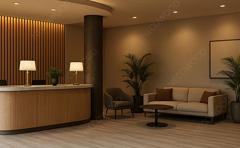 中規模のブティック ホテルでは、ロビー、廊下、公共エリア、客室を中心としたインテリア全体の刷新を求めていました。プロジェクトの目標には、統一された木材のような美学、メンテナンスの削減、改修時のダウンタイムの最小限化が含まれていました。建築家は、耐久性と迅速な設置プロファイルのために WPC 天井および壁システムを指定しました。